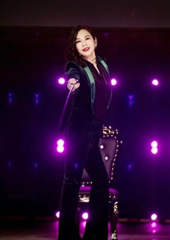 陈松伶不仅打头阵,还拿出了真本事。她拿着一根手杖翩翩上台,唱的是张学友的《饿狼传说》。