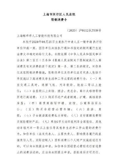 此前,张恒被限制消费一事登上热搜榜,受到众多网友关注。据天眼查显示,近日,郑爽前男友,上海鲸乖乖人工智能科技有限公司法定代表人、执行董事张恒收到限制消费令,发布法院为上海市闵行区人民法院。