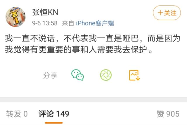 9月6日,郑爽前男友张恒在社交媒体发言:“我一直不说话,不代表我一直是哑巴,而是因为我觉得有更重要的事和人需要我去保护”。