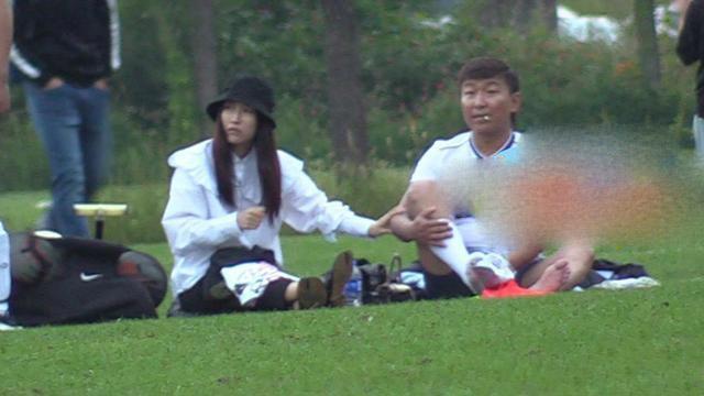 陈羽凡在踢球,何时珍就在旁白的草地上坐着等他,到了中场休息的时候,陈羽凡马上就跑来何时珍的身旁,点了根烟坐了下来,两人就这么看着赛场上的人踢球热聊。