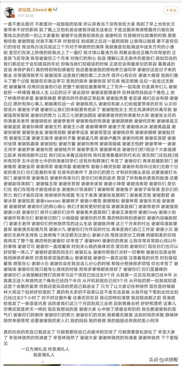 赖冠霖在社交平台写了一篇两千多字的小论文来总结在剧组的时光,并且满屏的谢谢,感谢到了剧组方方面面的人,网友们表示:“155个感谢,能把这么多名字都记住也是很强”。