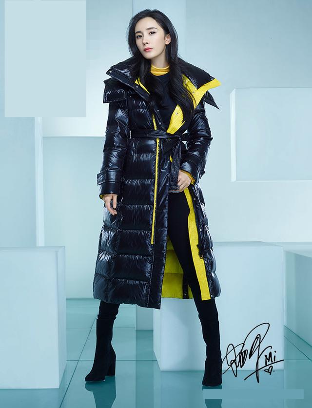 但一到广告大片,杨幂的画风就会变成下图这样。简陋的背景布置,搭配也显得很敷衍不走心。一件中长款的拼色羽绒,相信私服女王杨幂是绝对不会内搭短上衣+百褶长裙的,这样的搭配土气不显比例,没有一点点时尚女王该有的水准。