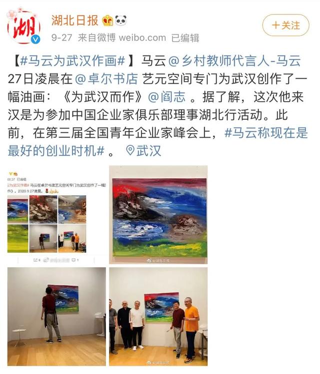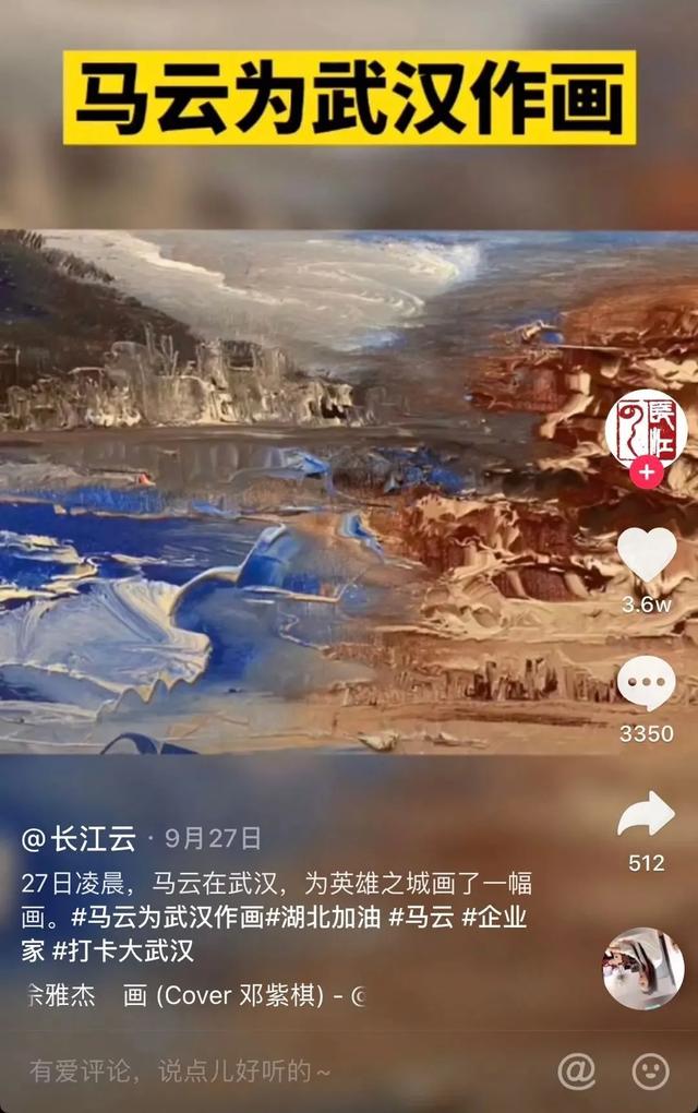 有网友解读这幅作品:马云的油画,拙中见奇,色彩绚丽,每一笔画出了大武汉的壮阔,蓝天白云、高山雄峻、树木葱郁,完美体现了大武汉唯美壮阔。