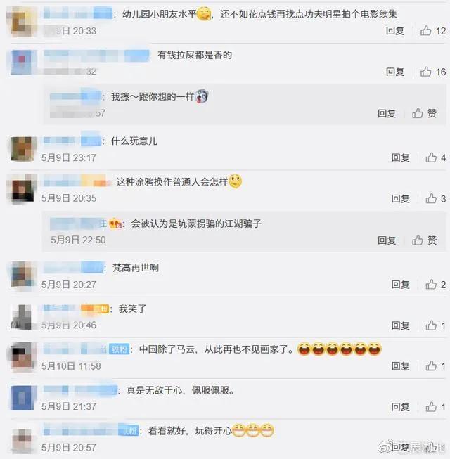 可是不管马云画什么,总有很多网友不买单:每次看马云的画,总要怀疑我的审美和三观,真的,画成这样还不如一个小孩子的涂鸦,丑不垃圾,随便搞搞几笔就成了名作,真不知道画中的“美”体现在哪里。