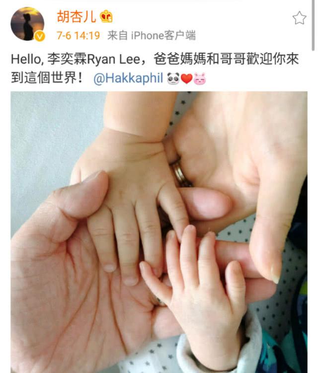 去年7月份,胡杏儿在社交平台上宣布自己生二胎,她是这样写的:“Hello,李奕霖Ryan Lee,爸爸妈妈和哥哥欢迎你来到这个世界。”