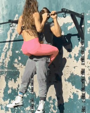 动作要领:借助一条单杠,跟另一半分别在两侧,同时向上发力,在锻炼时要注意保证体力,以防体力不支摔倒。
