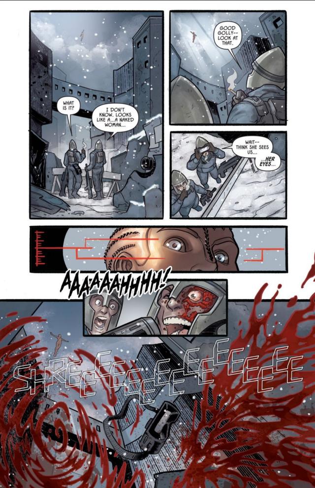 漫画接下来就是死灵机器人进入作战区,无神论的士兵第一次见到死灵,还没来得及反应过来,就被秒掉。