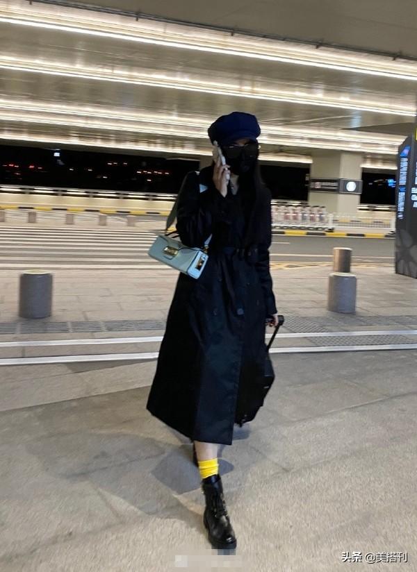 长风衣配裙装又美又飒,露出白嫩的脚踝,脚上是黄色中筒袜和黑色短靴,黑色短靴和头上的黑色贝雷帽都能为整个人增添复古摩登气息。尤其是贝雷帽,范冰冰这种戴帽檐的贝雷帽复古又休闲,比一般的贝雷帽更实用,能把头部包裹得更严实温暖。黄色中筒袜则很好的打破了全身黑的沉闷感,这么小面积的亮色既不影响低调酷帅范,又能给人几分小惊喜。