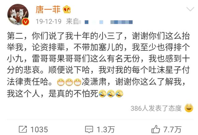 唐一菲对"小三"这顶帽子也多次公开解释,去年唐一菲仍然遭到谩骂,她在社交平台公开发文表示:你们说我十年的小三了,谢谢你们抬举我,我对你们每个泡沫星子付法律责任。