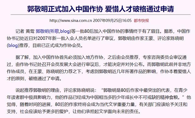 2007年,金丽红从中运作,郭敬明被作家王蒙和学者陈晓明介绍加入了中国作家协会。当时,作家陆天明怒斥“他入作协,要给80后树一个怎样的榜样?倡导一种什么样的原则?”但北京大学的张颐武教授和介绍人王蒙都认为,作协并不是选道德大使,进作协也并不意味着什么。”