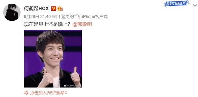 经过了《演员2》郭敬明的力挺之后,何昶希更是锁死了自己的导师,用自己的微博发郭敬明的照片,cue郭敬明。