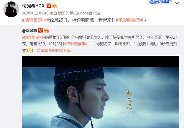 郭敬明的新电影宣布定档,何昶希积极的转发了郭敬明的动态,虽然不知道两个人到底有没有进一步的合作,但是何昶希抱大腿的心态倒是昭然若揭。