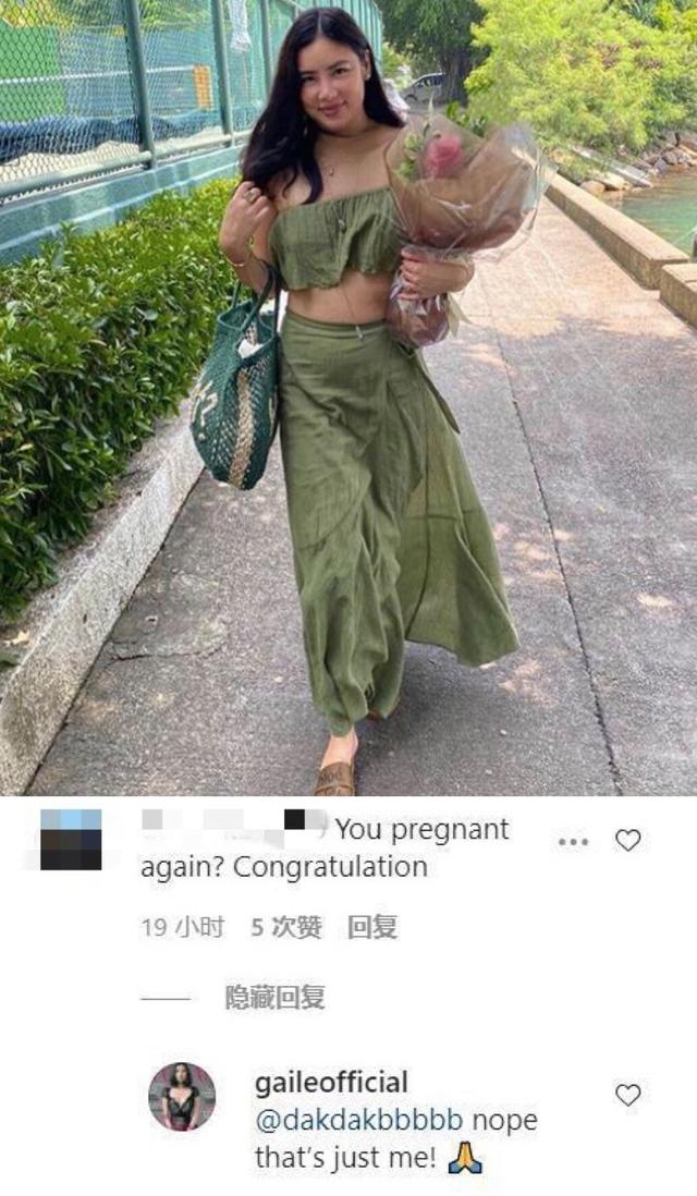 此前,她在社交平台晒出自己穿露脐连衣裙的照片,小腹凸起明显,不少网友猜测她已经怀上二胎,纷纷在评论区恭喜她,乐基儿只好无奈回复道:"照片上只有我一个人。"