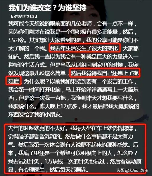 为此,她想通过看心理医生和针灸治疗来改变自己的心态,每天都会去找心理医生去倾诉,过程中她还进行运动康复,这一点她还十分感谢姚晨,因为是她介绍她这种治疗方法。