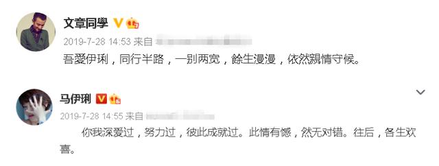 婚姻关系结束时,文章与马伊琍各自发文道珍重,从此一别两宽。马伊琍在文中写道:"你我深爱过,努力过,彼此成就过。此情有憾,然无对错。往后,各生欢喜。"