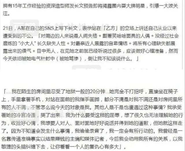 原因是一位拥有15年工作经验的资深造型师发长文预告将揭露圈内某耍大牌明星,原本没有引起多大的注意,但是最后带上了“Psycho”和“monster”的话题,引起网友猜测。