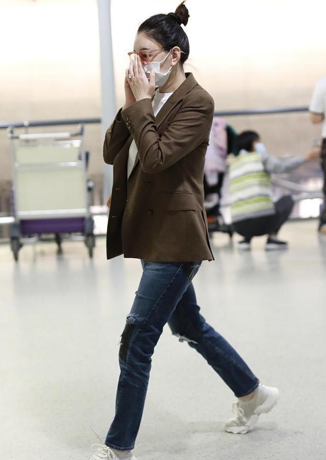 第一:先来分析一下李小冉的这身机场穿搭,虽然穿着棕色西服,整体配色也不抢眼,依旧是很有活力。