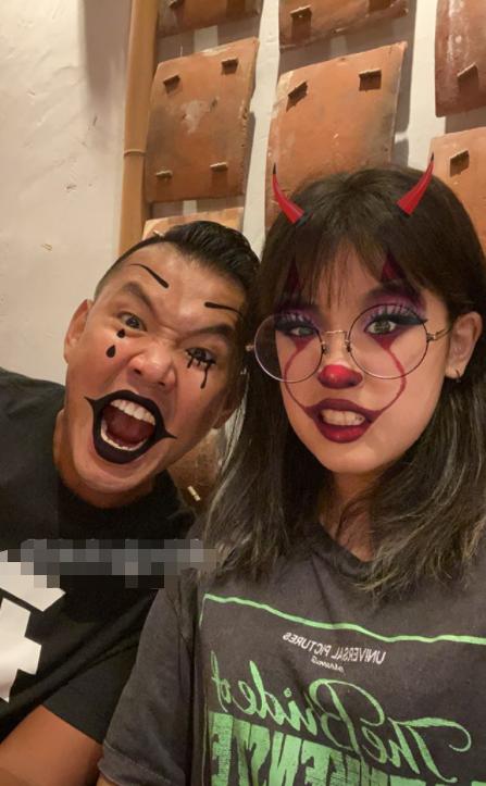 这次,贾静雯修杰楷一家的好朋友陈建州也一同出镜。在陈建州与梧桐妹的合照中,梧桐妹还是那副小恶魔的装扮,陈建州则与修杰楷一样被分配到了暗黑色妆容,他对着镜头龇牙咧嘴,表情十分搞笑。