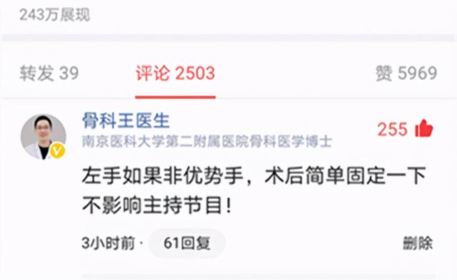 上图可以看到谢楠的左手绑上了石膏,因此是左腕部的骨折。如果右手是优势手(右撇子),那么并不会影响主持;如果左手是优势手(左撇子),则有可能会影响主持。