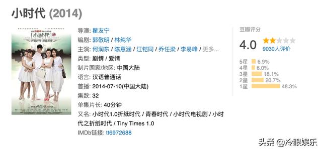 后来瞿友宁拍的《小时代》开播,电视剧呈现的效果非常不好,拍得又土又无聊不说,IP的光也完全没沾到,豆瓣评分仅4分,甚至低于以差出名的电影版。尽管当时的阵容并不差,陈意涵、何润东、乔任梁、金世佳……不少知名演员扮演主要角色。