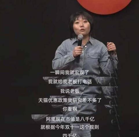 “一瞬间我就宏观了,我就给老板打电话,我说,天猫的优惠政策我研究得差不多了,你看啊,阿里现在市值8000亿,根据今年双11这个规则,四千亿,差不多能盘下来。老板说,雪琴你真是个天才呀,问题是这个四千亿从哪里来啊?我说老板,咱有花呗啊。老板说,那咱得接多少活儿才能还上花呗?我说你是不是傻,阿里都是咱的了,你还花呗干什么啊。”