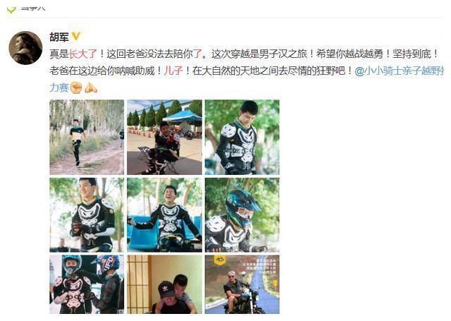 《爸爸去哪儿》节目结束后,胡军也会时不时地在社交平台上分享儿子康康的成长的点滴。前不久,胡军晒出了几张儿子康康参加越野拉力赛的照片。并配文说道:"真是长大了,这回老爸没法去陪你了。这次穿越是男子汉之旅。"