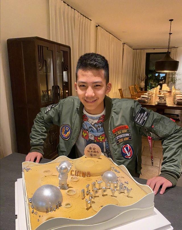 从康康单独的庆生照中可以看出12岁的他充满朝气。康康身后的餐桌也很壮观,像是开会使用的会议桌一样。