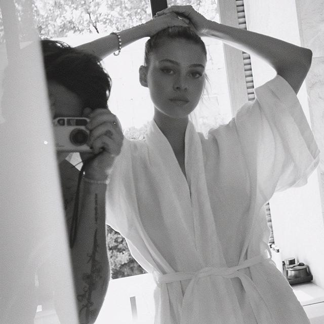 哪怕是黑白滤镜的照片,也仍旧清晰可辨出版型宽大的白色浴袍,很是轻透的一层面料让妮可拉玲珑有致着的身材曲线是若隐若现着的,而两侧滑至臂弯处的衣袖更是凸显出她手臂的纤细。