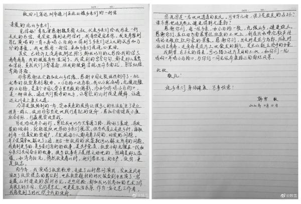 11月12日,韩雪在微博发布了给四川省达州市通川区北山镇乡亲们的回信。