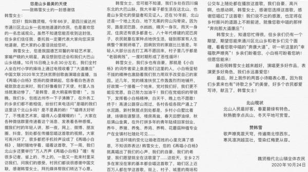 北山村民给韩雪的感谢信