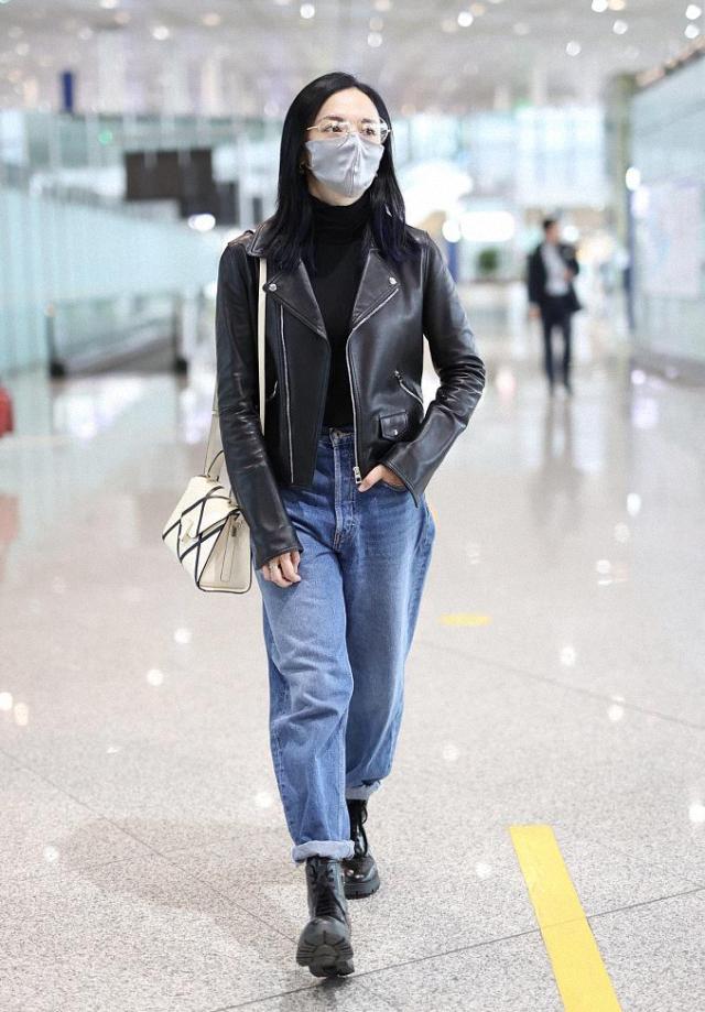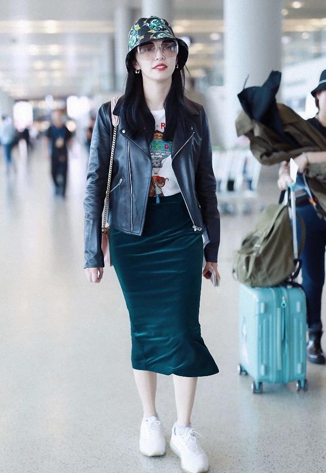 ?姚晨这款皮衣,之前的机场造型中,也出现过,当初则是另一种风格,显得更加的淑女范。黑色的皮衣,内搭一件白色的印花T恤,下搭一条蓝色的丝绒半身裙,包臀裙的款式,把她的身材也是很好的修饰。硬朗的皮衣搭配温柔的半身裙,这种混搭的风格,也是很显个性和时髦呢。配上一双小白鞋,也是更显混搭风格。