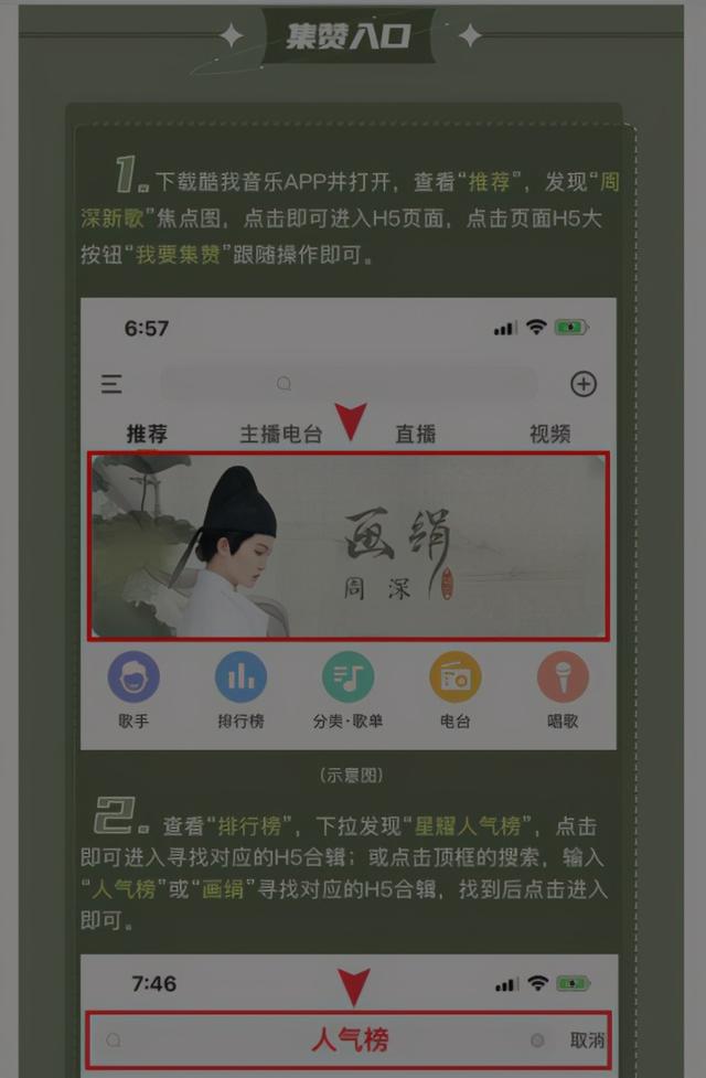 ¼¯ÔÞÈë¿ÚÓжþ:Ò»ÊÇÏÂÔØ¿áÎÒÒôÀÖAPP²¢´ò¿ª,²é¿´¡°ÍƼö¡±,·¢ÏÖ¡°ÖÜÉîи衱½¹µãͼ,µã»÷¿É½øÈëH5Ò³Ãæ,ÔÙµã»÷´ó°´Å¥¡°ÎÒÒª¼¯ÔÞ¡±¸úËæ²Ù×÷¼´¿É;Æä´Î¿É²é¿´¡°ÅÅÐаñ¡±,¡±ÏÂÀ·¢ÏÖ¡°ÐÇÒ«ÈËÆø°ñ¡±,µã»÷¼´¿É½øÈëѰÕÒ¶ÔÓ¦µÄH5ºÏ¼,Ò²¿ÉÔÚ¶¥¿òËÑË÷¡°ÈËÆø°ñ¡±»ò"»¾î",ѰÕÒ¶ÔÓ¦H5ºÏ¼¡£ÓÐÏë·¨?ÄǾ͸Ͽ츶ÖîÐж¯°É!