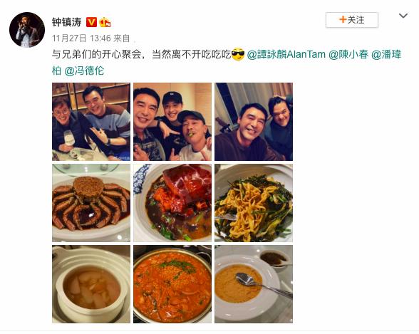钟镇涛私下里生活非常惬意,平时在自己的豪宅里做做饭,甚至隔三差五就要与好友谭咏麟一起聚会喝酒。就在11月27日,钟镇涛还与谭咏麟、陈小春、冯德伦、潘玮柏一起聚餐,众人围坐在一起吃部队火锅,气氛融洽。