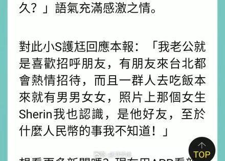 小S当然第一时间出来回应,称:“我老公就是喜欢招待朋友...照片上那个女生我也认识”。