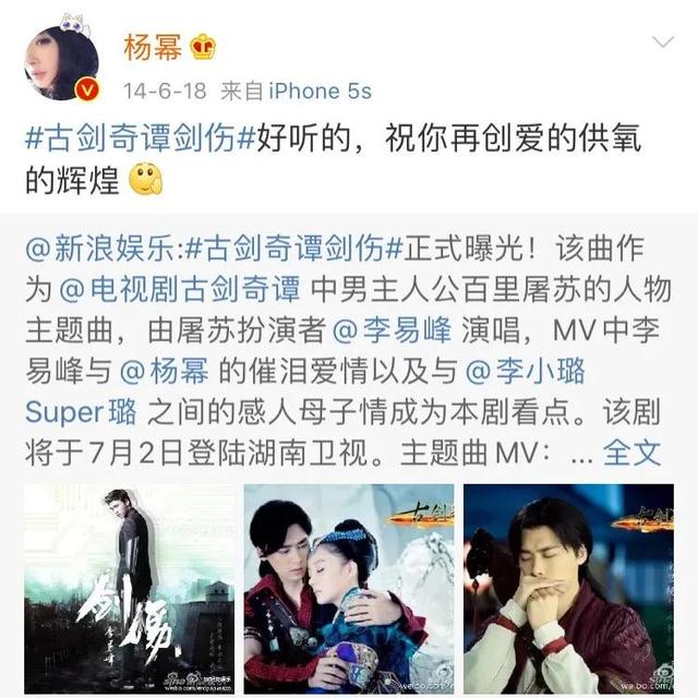 到了2014年,杨幂在微博上转发李易峰为电视剧《古剑奇谭》演唱的主题曲,还不忘回cue自己的梗:“祝你再创‘爱的供氧’的辉煌。”