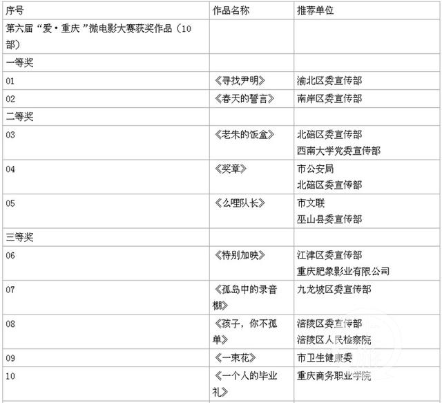 第六届“爱·重庆”微电影大赛表彰作品名单