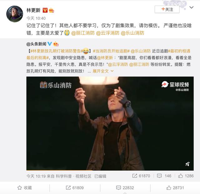 1905电影网讯 近日,林更新在电视剧《最初的相遇最后的别离》中为女主放孔明灯的情节被消防员叔叔警告是安全隐患。乐山消防发博喊话林更新:“剧里高甜,你们看着都好浪漫,看着全是隐患。报平安,千里传火患,真是不良示范!”泰州消防、四川巴州消防纷纷转发并提醒:燃放孔明灯有风险,能别放就别放。
