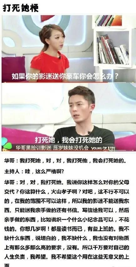 这时候,有网友翻出来了曾经霍建华的一段采访,采访中的霍建华被问到,如果被粉丝送自己豪车会怎么办时,霍建华直言:“打死她,我会打死她的。我的影迷不能送我东西,只能送我亲手做得,还有书信”他还反复强调,自己什么都不缺,也没有对物质上有那么多高的要求,他还提醒粉丝千万要对自己的人生负责。