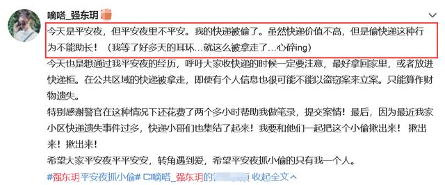 12月24日,90后女星强东玥在社交平台上称,在平安夜快递却遭偷窃,夜晚花费两个小时寻找丢失的物品。