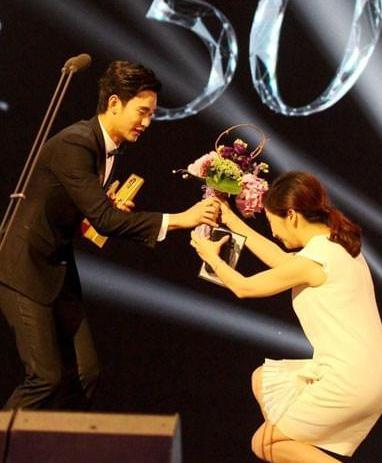 台湾主持人陶晶莹也曾做出这样匪夷所思的事情,在某活动中,担任颁奖嘉宾的她向韩国明星金秀贤下跪,并献上鲜花,公共场合随意下跪,作为公众人物属实不妥。