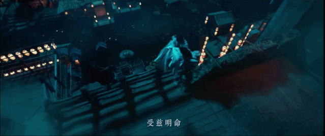 采用对称式构图的美学设计,亮黄色的光源与暗处背景形成强烈的明暗对比。(上为《妖猫传》,下为《晴雅集》,下同)