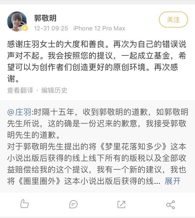 2020年12月31日0时整,郭敬明在微博对曾经的抄袭行为进行了一个他称之为“迟到太久的道歉”。当天上午,被抄袭作品的作者庄羽在微博表示接受其道歉,但要求用双方的相关版税及收益成立一个“反剽窃基金”。之后,郭敬明微博回应,同意成立该基金,“感谢庄羽女士的大度和善良”。