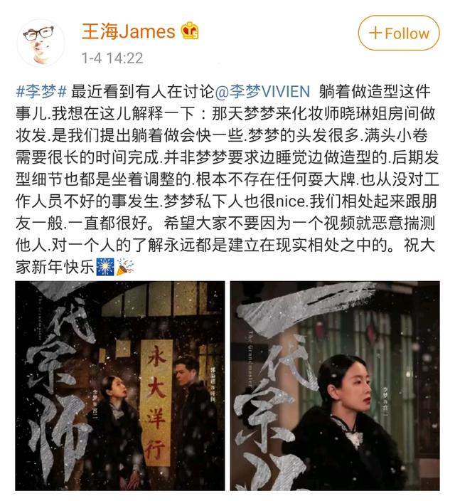 先是其造型师发文否认李梦耍大牌,针对网友对李梦躺着做造型是耍大牌的言论,其造型师王海则解释是他们提出的躺着做会快一些,与李梦本人并无关系,呼吁大家不要恶意揣测。