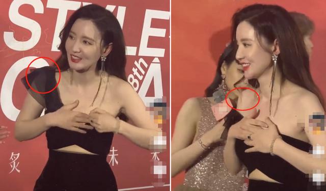 而她像块布一样的单薄上衣却因为没有支撑,遵从地心引力慢慢开始往下滑,这时候她也有点慌了。她先是用手将上衣往上提,并对现场人员表示了抱歉,随后就紧捂胸口离开现场,最后有一女生帮她整理。