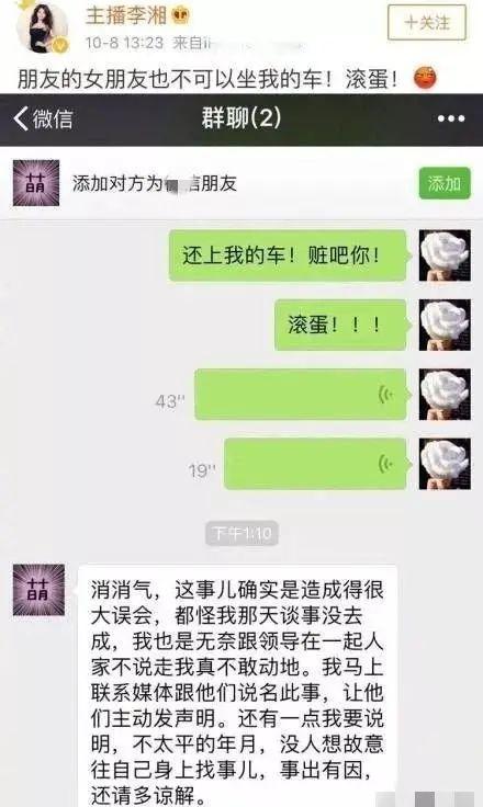同时,李湘也在社交媒体上对此事进行了回应,晒出和朋友的聊天记录,并配文称:”朋友的女朋友也不可以坐我的车,滚蛋!”
