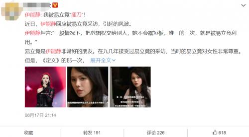 此前,伊能静因在《定义》采访中吐槽王智王丽坤、拉踩梅艳芳引发争议,遭到网友炮轰。近日,营销号曝出伊能静对舆论风波的回应,称伊能静认为被易立竟利用造话题,并总结为“伊能静插刀易立竟”,8月18日,伊能静发博回应“未用任何插刀说法,内容不实”,随后秒删。