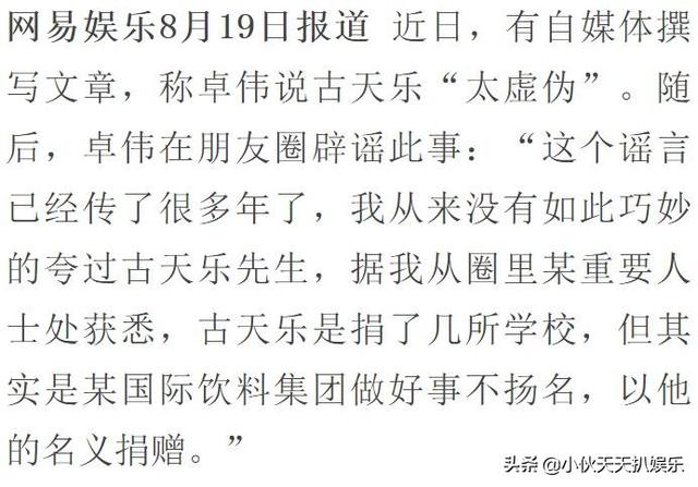 消失许久的卓伟再一次出现在大众面前就丢下了一颗重磅消息。其巧妙的用词,含糊的态度让人不禁浮想联翩。众所周知,古天乐捐建了上百所学校,从而被网友称为"古校长"。古校长这些年一直致力于慈善事业,挖井、捐建学校,慰问山区的孩子,也曾表达了自己要一直演一直捐建学校的愿望。