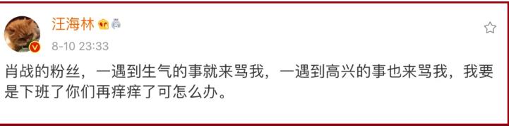 8月10日晚近午夜23:33,汪海林在社交媒体上发布,粉丝在生气时骂我,在开心时骂我。如果我下班后再次发痒怎么办?