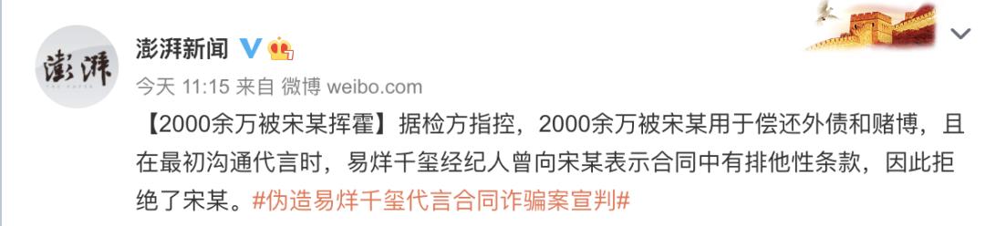 据澎湃新闻消息,近2300万的代言费已被宋某用于赌博和偿还外债 。