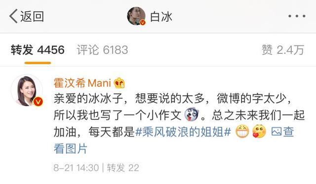 经纪人霍汶希也专门转发白冰的微博,并写了小作文。